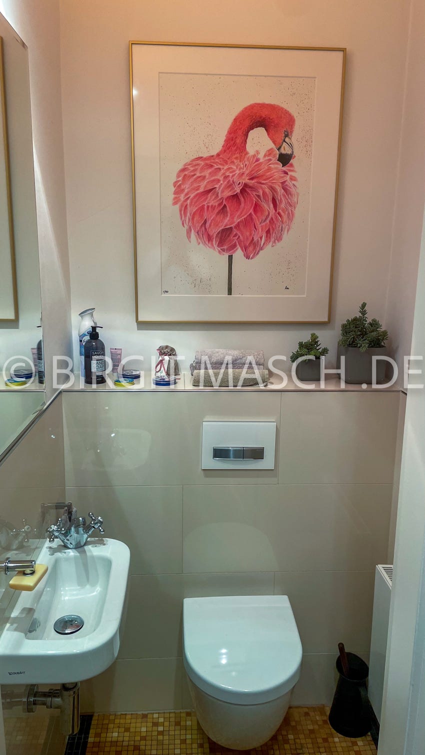 „Wie versprochen, ein Nachweis, dass es hängt. Und das soll keine Missbilligung Ihres Werkes sein. Es hat den Ort gefunden, an dem es alle unsere Gäste bewundern können, nämlich im Gästebad. “